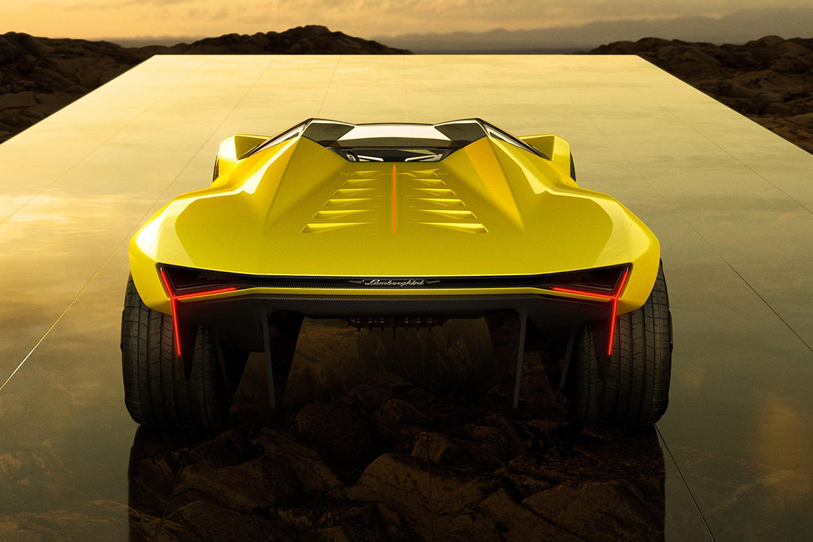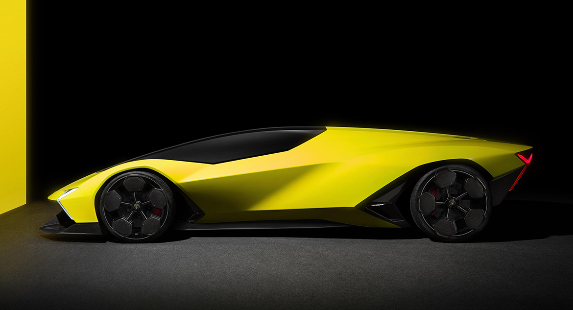 Un’identità inconfondibile non solo per la forma a cuneo del profilo, prosegue Borkert. «Il frontale celebra lo “sharknose”, tutte le superfici sono accelerate, super-pulite, amo molto questa transizione da negativo a positivo», dice facendo scorrere la mano sulla fiancata. «Il posteriore è spettacolare, leggero e scavato in basso. Ricorda l’architettura di un catamarano. Trattandosi di pura ricerca formale non ci siamo preoccupati di questioni di fattibilità, come la dimensione del motore e il relativo spazio necessario». A differenza della Revuelto, non era infatti necessario mettere a vista il motore. La presenza dei dodici cilindri è evocata da altrettante nicchie sulla superficie disposte lungo un ipotetico asse di simmetria, creando così una sorta di colonna vertebrale che caratterizza la vista posteriore e in pianta.