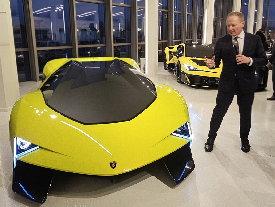 La Manifesto è una scultura di nome e di fatto, visto che si tratta di un modello di stile “pieno”. «Non esiste un abitacolo, al momento realizzato un video semplicemente impiegando quello della Terzo Millennio». Il progetto è stato condotto da quello che Borkert chiama “crazy corner”, un piccolo gruppo all’interno del Centro Stile incaricato di immaginare la Lamborghini di vent’anni da oggi, senza limiti progettuali, ipotizzando reinterpretazioni anche radicali del Dna del marchio. L’intelligenza artificiale ha iniziato a entrare nel processo creativo, ma in merito Borkert rassicura subito: la tecnologia è uno strumento, la decisione finale sarà sempre umana. «Manifesto è fantasia e ispirazione rese tangibili. Mostra come connettiamo le superfici, come creiamo purismo, come proiettiamo il nostro Dna nel futuro. Non è una questione di motori o tecnologia, ma di immaginazione: è il modo per mantenere vivo il sogno Lamborghini».