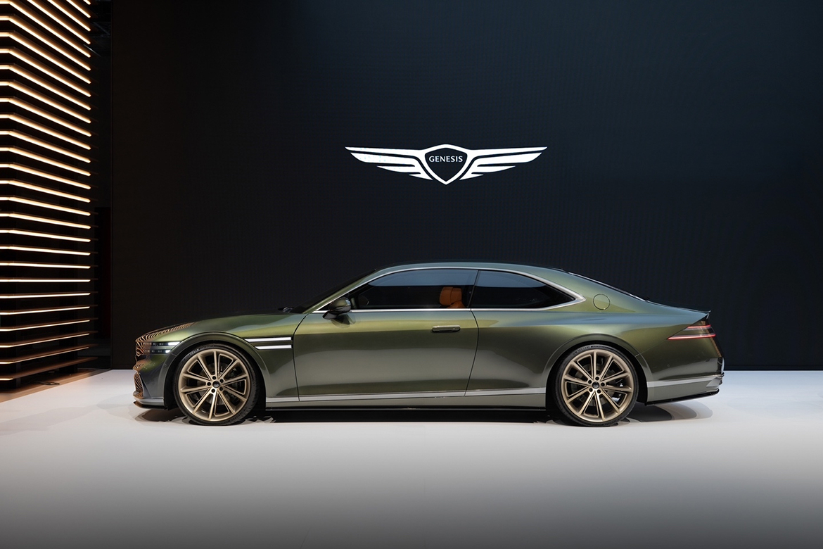 Anche la settima generazione della Grandeur, quella attuale, riprende alcuni tratti dell’originale reinterpretandoli in chiave moderna. Uno su tutti è il celebre “finestrino opera” sul montante C, che ritorna come richiamo grafico. Le proporzioni sono oggi più pulite e aerodinamiche, grazie anche ai vetri senza cornice, alla fascia luminosa orizzontale che unisce anteriore e posteriore e a un design essenziale fondato su equilibrio e proporzioni. E questo per omaggiare una delle vetture più di successo di Hyundai nei mercati extraeuropei, tanto che in patria è un simbolo culturale e sociale. «Una berlina è un simbolo di status… mostra alle persone che hai raggiunto un certo livello» conclude Danza. A CDE Classic debutta in Europa anche la Genesis X Gran Coupé, concept car che interpreta in una direzione più emotiva la filosofia del marchio Genesis “Athletic elegance”, equilibrio tra forza e raffinatezza. Pur mantenendo la distanza tra gli assi della G90, l’abitacolo più compatto rende l’auto più raccolta e sportiva. L’ispirazione viene dal Mediterraneo e si riflette nei colori esterni e interni – verde oliva abbinato a toni champagne e pelle cognac – e in un design che gioca su proporzioni eleganti, superfici pulite e dettagli sportivi come i passaruota pronunciati e il cofano clamshell più ampio rispetto alla G90 standard. L’abitacolo, con illuminazione ispirata alle foglie d’ulivo, cristalli Swarovski e materiali premium, completa un’esperienza sensoriale raffinata, armonizzando lusso e sportività.