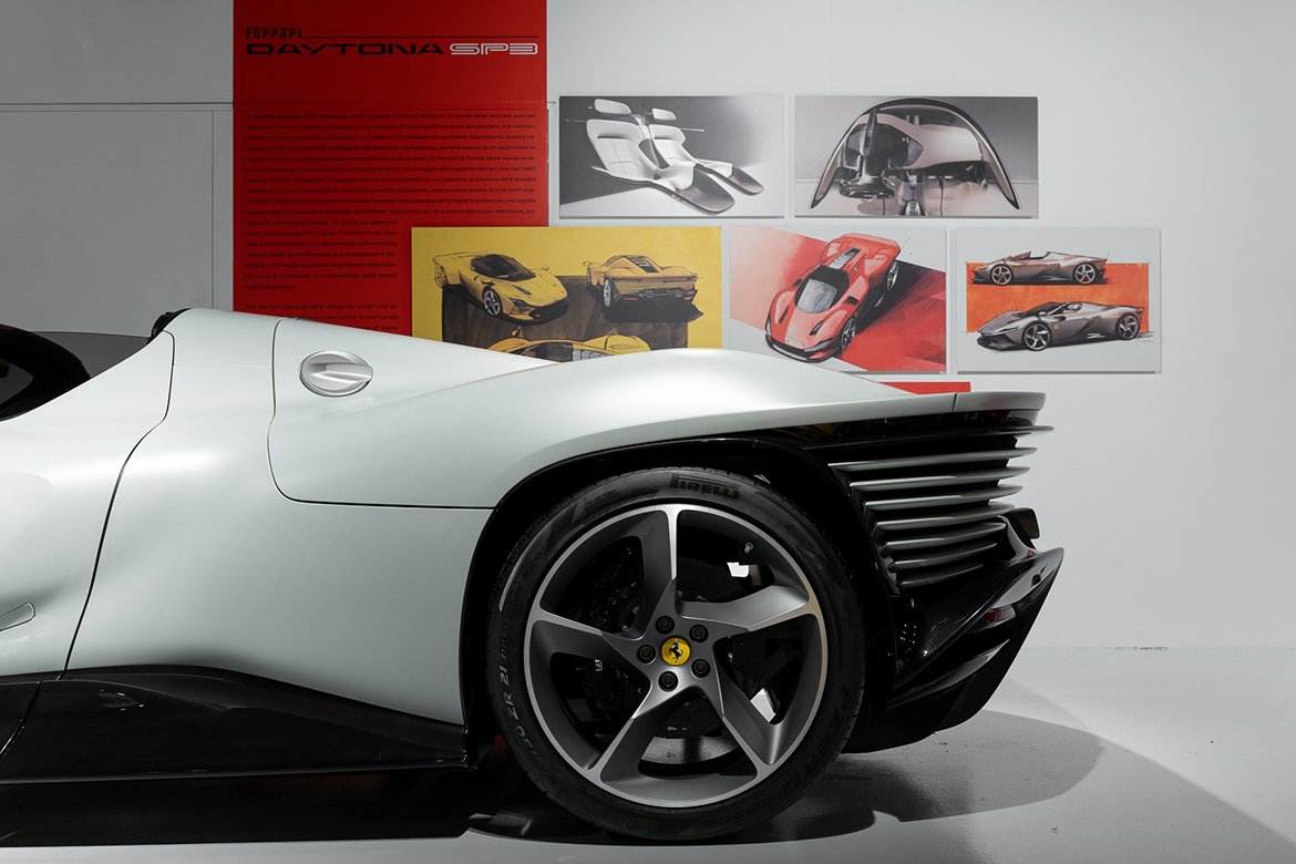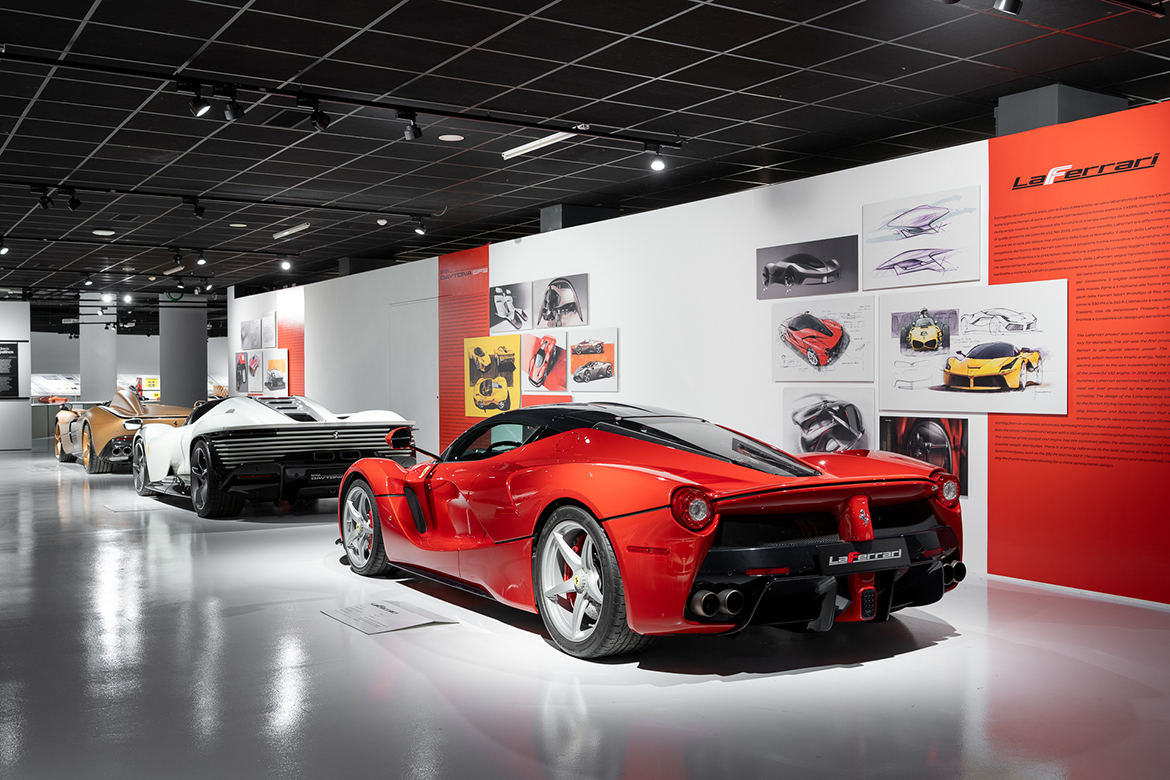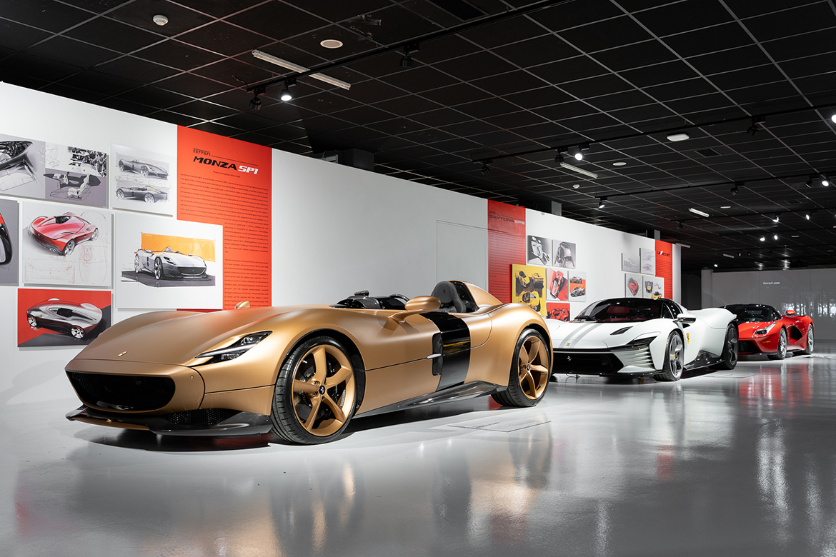 There are 1:1 scale models on display – the 2014 Fxx-K, winner of the 2016 Compasso d’Oro award, an extreme version of LaFerrari designed exclusively for track use; the 2021 Daytona SP3, part of the Icona series inspired by classic cars; the 2022 Vision Gran Turismo, the Maranello-based manufacturer’s first concept car dedicated to the world of virtual motorsport, created to celebrate Ferrari’s 75th anniversary; the 2024 F80, representing the pinnacle of technology applied to a supercar; and the 2024 12Cilindri, combining tradition and innovation. Production cars include the 2013 LaFerrari, the first Ferrari road car to use hybrid electric power; the 2018 Monza SP1, winner of the 2020 Compasso d’Oro award and a contemporary reinterpretation of an iconic model from the brand; the 2019 SF90 Stradale, the first production PHEV (Plug-in Hybrid Electric Vehicle); the 2021 296 GTB/GTS, a revolutionary 6-cylinder car in the range; and the 2022 Purosangue, winner of the 2024 Compasso d’Oro award, with its innovative “sporting transaxle” architecture, featuring a mid-front engine and rear gearbox. The selection is completed by two unique models: the SP38, a one-off from 2018, and the P80/C from 2019.