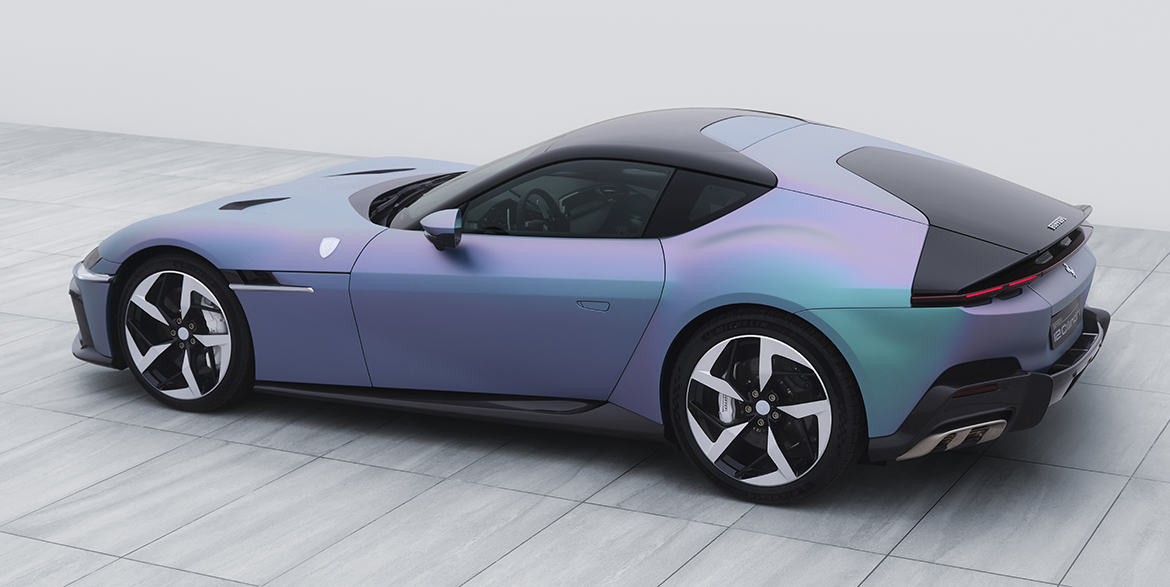 This 12Cilindri is instantly recognizable thanks to the new Yoonseul transitional paint color, developed specifically for the car. This unique color is inspired by Korean tradition, combining the history and heritage of the region with references to Celadon ceramics, with their multiple shades of green, and the charm of cosmopolitan Seoul, pulsating to the rhythm of K-pop. The result is a vivid, iridescent finish that varies from green to purple with blue reflections, evoking the sunlight sparkling on the sea, Yoonseul in Korean.