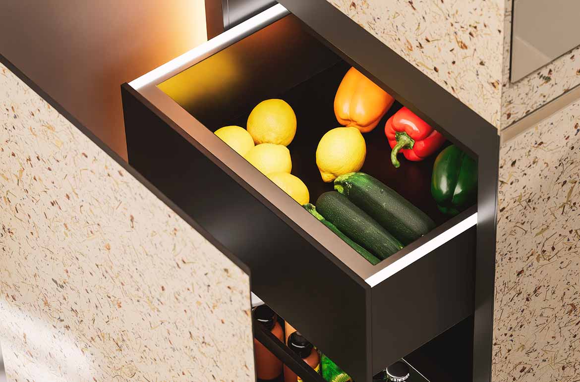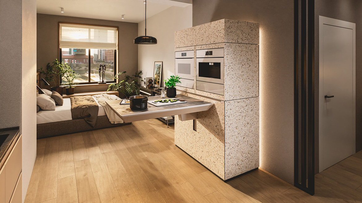What inspired this concept? “We addressed the growing trend of urban settings with limited space. Those who live primarily in large cities are familiar with the problem of the high costs associated with having large spaces, where even the kitchen area is sacrificed. With this versatile unit, featuring large side cabinets that enclose a cooking space within just a few square meters, we didn’t want to compromise on the cooking experience, demonstrating that it’s possible to cook—and cook well—by concentrating various functions into a single space.” The principle is simple: instead of separating spaces, functions intertwine, and thanks to flexible and adjustable elements, the spaces adapt to daily life rather than to the home’s layout.