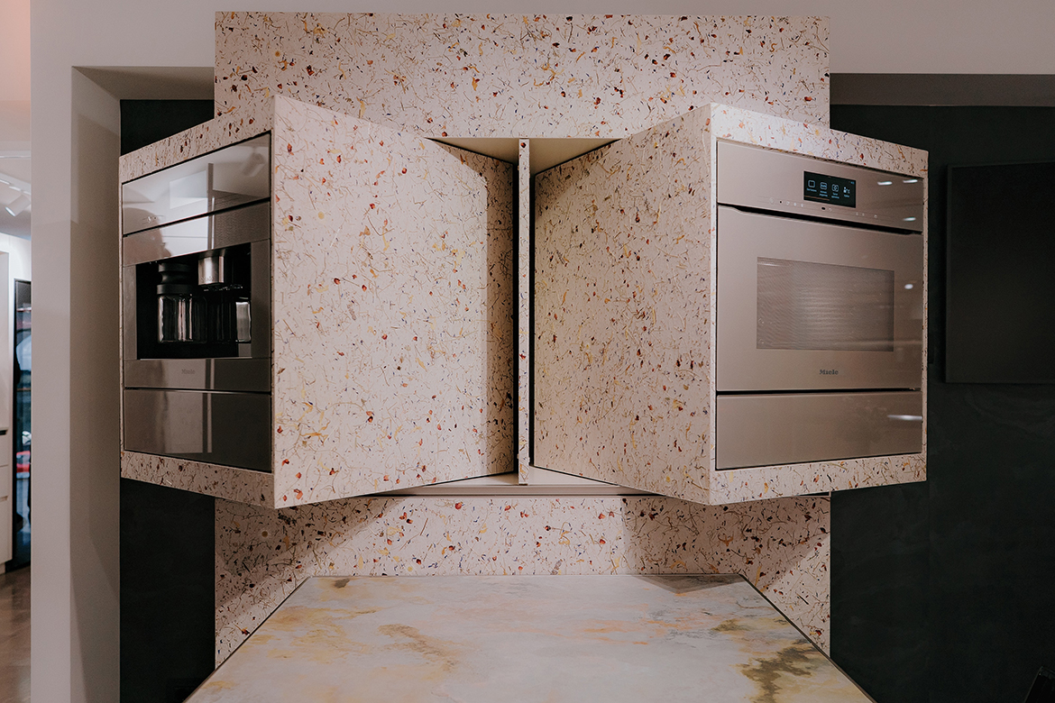 The texture of the furniture evokes nature and is particularly intriguing… “Of course, we’re interested in sustainability, but in this case the idea was to create an oasis of relaxation, a pleasant vacation-like feeling, even through the color and decor. That’s why we chose a covering that stimulates the senses—touch and smell—with this extremely natural wallpaper that incorporates daisies and Austrian mountain grass into the paper.” Digital assistance is obviously an integral part of the concept, where digital features accompany the entire cooking process while the app plans workflows, synchronizing the appliances. We ask what the evolution of the kitchen will look like in the coming years: “The kitchen environment today is truly very smart, but I believe we’ll need to combine this aspect—which is certainly important—with a sense of tangibility. In this scenario, technology can even disappear (as in this case) while continuing to offer a genuine experience tied to the cooking process and its rituals. After all,” concludes Janina Forberger, “people have always gathered around a fire.”